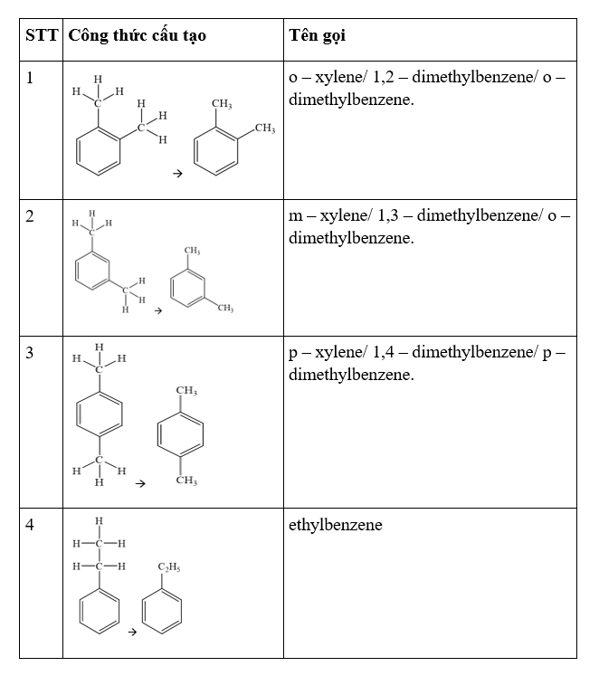 Reforming octane (C8H18) thu được các arene có công thức phân tử C8H10 Hãy viết công thức cấu tạo của các arene này.