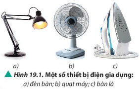 Khi hoạt động, các thiết bị tiêu thụ điện biến đổi điện năng thành các dạng năng lượng khác. Chẳng hạn, bóng đèn (Hình 19.1a) biến đổi một phần điện năng thành quang năng, quạt máy (Hình 19.1b) biến đổi một phần điện năng thành cơ năng, bàn là (Hình 19.1c) biến đổi điện năng thành nhiệt năng,…