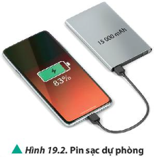 Một pin hay ắc quy khi lưu hành trên thị trường sẽ có thêm thông số cho biết về khả năng cung cấp điện của nó cho các thiết bị khác, đơn vị Ah (ampe giờ). Ví dụ: Một ắc quy có thông số 10 Ah có nghĩa nó có khả năng cung cấp dòng điện 1 A trong 10 giờ hoặc cung cấp dòng điện 5 A trong 2 giờ, hoặc cung cấp dòng điện 10 A trong 1 giờ,… Hiện nay, pin sạc dự phòng (Hình 19.2) đang được sử dụng phổ biến để nạp điện cho các thiết bị như điện thoại thông minh, máy tính bảng. Xét một pin sạc dự phòng có thông số 15 000 mAh đã tích đầy điện, khi được kết nối với một thiết bị di động sẽ hoạt động ở công suất 10 W và hiệu điện thế giữa hai cực của pin bằng 5 V. Tính điện lượng còn lại trong pin sạc dự phòng khi sử dụng nó để sạc thiết bị trên trong 30 phút.