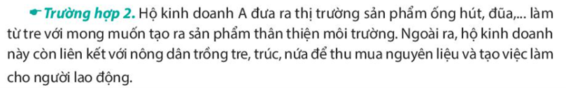 – Hộ kinh doanh A đã có trách nhiệm đưa ra thị trường những sản phẩm thân thiện với môi trường như ống hút, đũa,…làm từ tre. Hơn nữa, hộ kinh doanh A còn thu mua nguyên liệu từ người nông dân, tạo việc làm cho người lao động, góp phần thúc đẩy sự phát triển kinh tế – xã hội.
