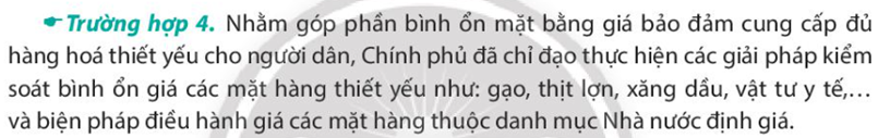 Vai trò của Nhà nước trong trường hợp trên: Điều chỉnh và khắc phục những vấn đề nảy sinh trong quá trình phát triển kinh tế – xã hội, cụ thể trong trường hợp này Chính phủ đã chỉ đạo thực hiện các giải pháp nhằm bình ổn giá các mặt hàng thiết yếu và điều hành giá các mặt hàng thuộc danh mục Nhà nước định giá nhằm bình ổn mặt bằng giá bảo đảm cung cấp nhàng hóa thiết yếu cho người dân