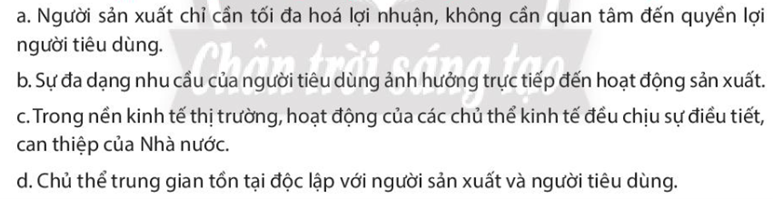 d – Em không đồng tình với ý kiến này vì chủ thể trung gian đóng vai trò là cầu nối giữa người sản xuất và người tiêu dùng. Nếu không có những chủ thể trung gian này thì người sản xuất sẽ khó có thể bán hết được sản phẩm của mình, còn người tiêu dùng sẽ không thể tiếp cận được những mặt hàng đó của người sản xuất.