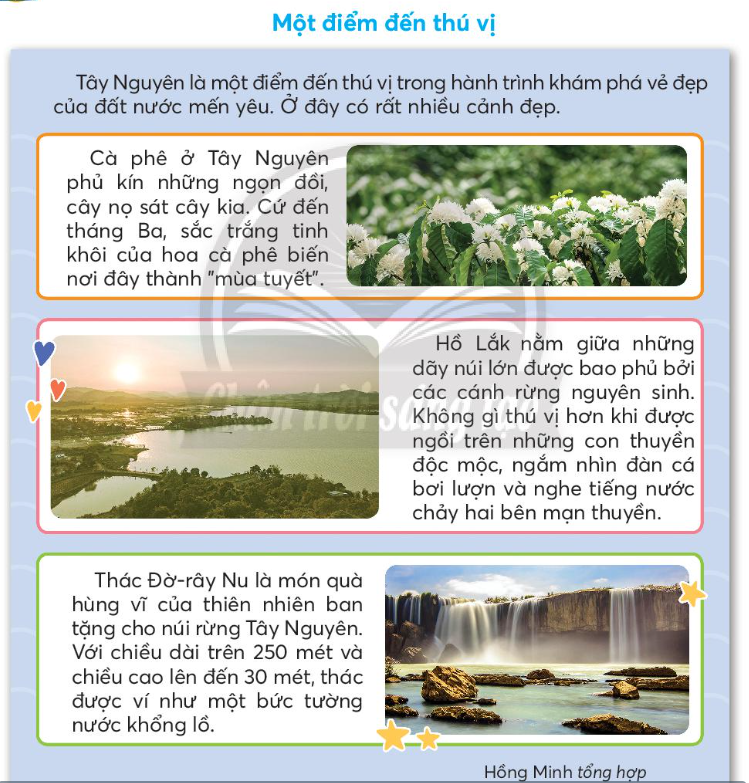 Thi kể tên các cảnh đẹp trên đất nước Việt Nam. Đọc và trả lời câu hỏi. Cây và hoa cà phê ở Tây Nguyên có đặc điểm gì. Điều thú vị nhất khi đến thăm hồ Lắk là gì. Những chi tiết nào cho thấy thác Đờ-rây Nu rất hùng vĩ. Em thích điều gì ở Tây Nguyên. Vì sao. Vì sao nói "Tây Nguyên là một điểm đến thú vị trong hành trình khám phá vẻ đẹp của đất nước mến yêu." Nói 1 – 2 câu về: Hoa cà phê. Hồ Lắk. Thác Đờ-rây Nu