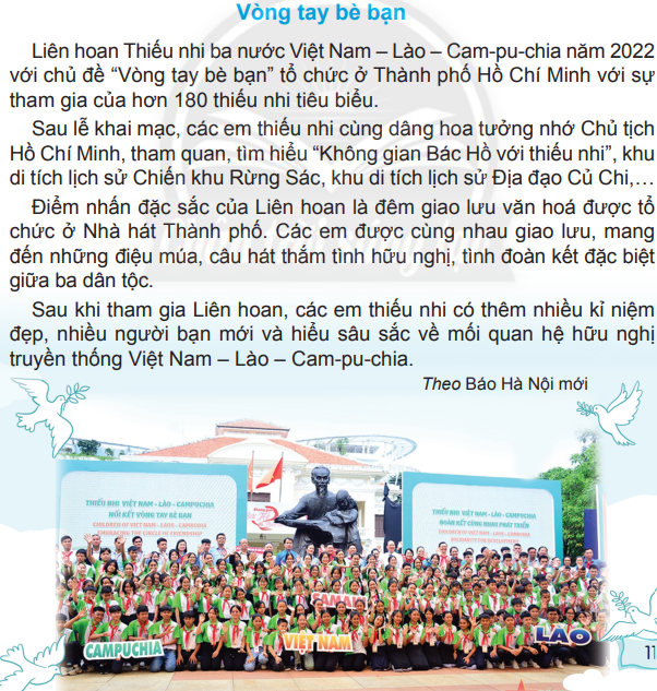 Cùng bạn hỏi đáp về tình cảm, cảm xúc khi tham gia một hoạt động dành cho thiếu nhi dựa vào gợi ý. Chủ đề của Liên hoan Thiếu nhi ba nước Việt Nam – Lào – Campuchia năm 2022 hướng tới điều gì. Những hoạt động các em thiếu nhi thực hiện sau lễ khai mạc có ý nghĩa như thế nào. Vì sao đêm giao lưu văn hóa được xem là điểm nhấn đặc sắc của Liên hoan. Liên hoan Thiếu nhi ba nước Việt Nam – Lào – Campuchia đem lại điều gì cho các em thiếu nhi. Nếu được tham gia đêm giao lưu văn hóa với các bạn thiếu n