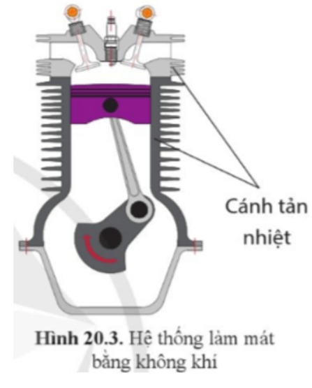 Quan sát hình 20.3, chỉ ra các bộ phận chính và nguyên lí làm việc của động cơ làm mát bằng không khí