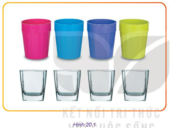 Hình 20.1 là hai bộ cốc uống nước với chất liệu, màu sắc và kiểu dáng khác nhau. Là một người tiêu dùng, em sẽ chọn mua bộ nào? Là một người thiết kế, em thích sản phẩm thiết kế nào? Hãy giải thích về lựa chọn của mình.