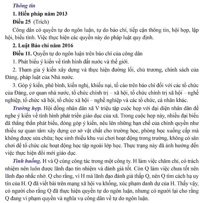 b. Trong tình huống, hành vi của Q là vi phạm quyền và nghĩa vụ công dân về tự do ngôn luận, vì đã lợi dụng quyền tự do ngôn luận để xâm phạm uy tín, danh dự của H, xâm phạm quyền và lợi ích hợp pháp của H.