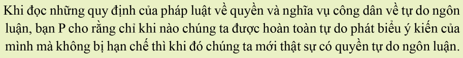 Em không đồng ý với ý kiến của bạn P vì khi thực hiện quyền tự do ngôn luận, công dân có nghĩa vụ tuân thủ pháp luật, thực hiện trong khuôn khổ pháp luật. Như vậy mới tránh được những hành vi vu khống, bịa đặt sai sự thật.