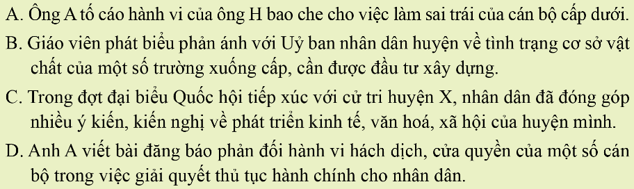 Hành vi không thể hiện quyền tự do ngôn luận: A. Ông A tố cáo hành vi của ông H bao che cho việc làm sai trái của cán bộ cấp dưới. Vì hành vi của ông A là thực hiện quyền tố cáo, không phải quyền tự do ngôn luận.