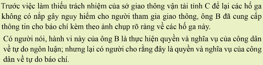 Em đồng ý với ý kiến cho rằng đây là quyền và nghĩa vụ của công dân về tự do báo chí vì: Quyền tự do báo chí là quyền của công dân được sáng tạo tác phẩm báo chí, cung cấp thông tin cho báo chí, phản hồi thông tin cho báo chí. Việc ông B đã cung cấp thông tin cho báo chí kèm theo ảnh chụp rõ ràng về các hố ga này là quyền tự do báo chí.