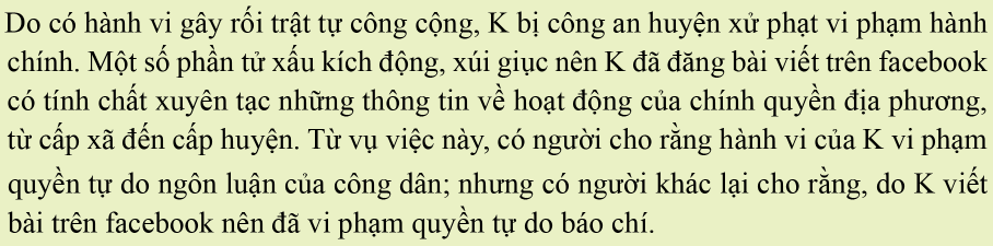 a. Em đồng ý với ý kiến cho rằng K vi phạm quyền tự do ngôn luận vì uyền tự do ngôn luận là quyền của công dân được tự do phát biểu ý kiến, bày tỏ quan điểm của mình về tất cả các vấn đề chính trị, kinh tế, văn hóa, xã hội của đất nước dưới hình thức lời nói, văn bản điện tử như zalo, facebook,…hặc dưới hình thức khác. Còn quyền tự do báo chí là quyền của công dân được sáng tạo tác phẩm báo chí, cung cấp thông tin cho báo chí, phản hồi thông tin cho báo chí.