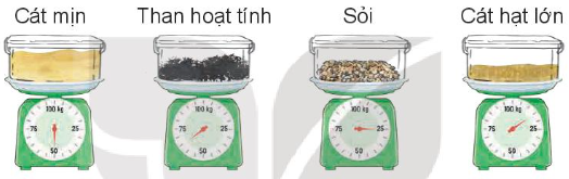 b) Ta thấy than hoạt tính nặng 65 kg; sỏi cân nặng 25kg; cát hạt lớn nặng 15 kg.