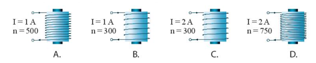 Nam châm điện nào dưới đây có lực mạnh nhất? (với ampe (A) là đơn vị đo cường độ dòng điện và n là số vòng dây)