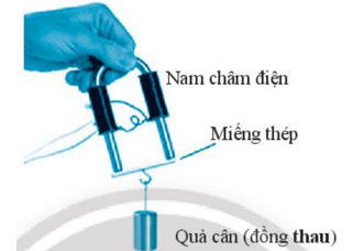 Một học sinh thực hiện thí nghiệm được mô tả như hình dưới đây. Học sinh này kết luận nam châm điện có thể hút được quả cân bằng đồng thau. Theo em, kết luận đó có đúng không? Giải thích vì sao.
