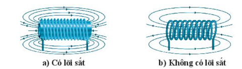 Cho hai ống dây như nhau, một ống có lõi sắt và một ống không có lõi sắt. Cho dòng điện có cùng cường độ đi qua hai ống dây. Dựa vào đường sức từ trường mô tả ở hình dưới đây, em hãy giải thích vì sao nam châm điện cần có lõi sắt.