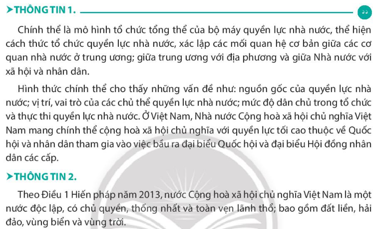 – Đọc thông tin 1, xác định chỉnh thể của nước Cộng hòa xã hội chủ nghĩa Việt Nam.