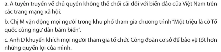 b – Hành động của chị M đã thể hiện rất rõ ý thức trách nhiệm của mình trong việc vận động người dân cùng tham gia chương trình để bảo vệ chủ quyền và lãnh thổ.