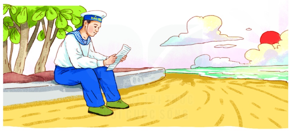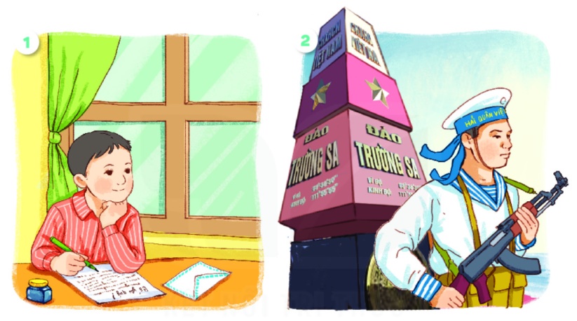 Tranh vẽ bạn nhỏ đang cầm bút để viết thư. Phía bên cạnh là chú hải quân đang canh gác biển đảo của đất nước ta.