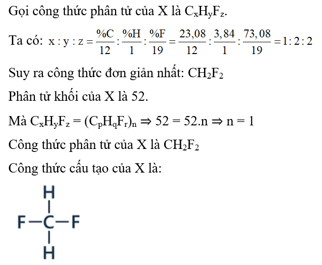 Hợp chất X hiện nay được sử dụng thế CFC do X không gây hại đến tầng ozone. Biết thành phần của X chứa 23,08% C, 3,84% H và 73,08% F về khối lượng và có phân tử khối là 52. Hãy xác định công thức cấu tạo của X.