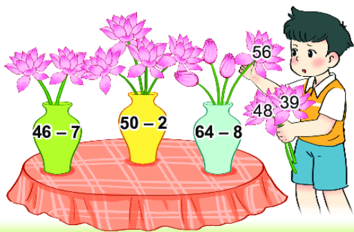 Vậy ta cắm bông hoa có ghi số 39 vào lọ hoa màu xanh lá, cắm bông hoa có ghi số 48 vào lọ hoa màu vàng.