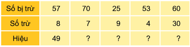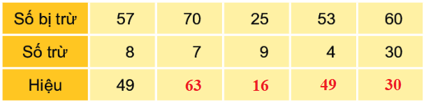 – Áp dụng công thức: Số bị trừ  – Số trừ = Hiệu.