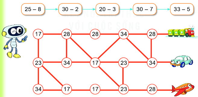 Thực hiện tính kết quả các phép tính, sau đó tìm đường đi thích hợp qua các số theo thứ tự, từ đó tìm được phương tiện mà bạn Rô-bốt chọn.