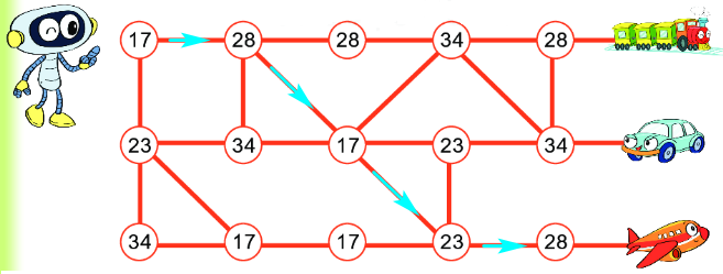 Rô-bốt đi theo thứ tự các số là kết quả của các phép tính dưới đây. Rô-bốt sẽ đến được tàu hoả, ô tô hay máy bay?