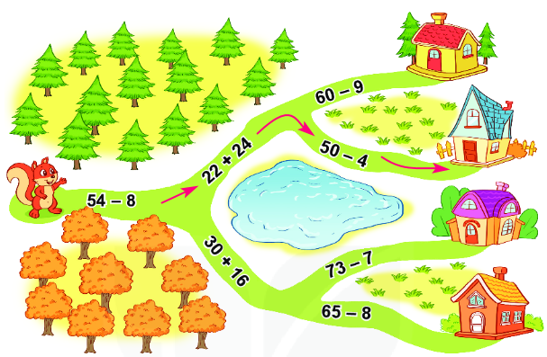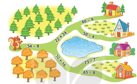 Đường về nhà sóc đi qua ba phép tính có kết quả bằng nhau. Tìm nhà cho sóc.