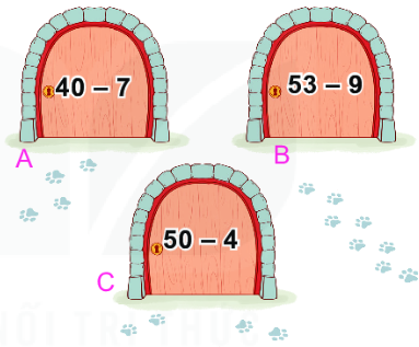 Thực hiện tính nhẩm các phép tính ghi trên các cánh cửa, so sánh kết quả để tìm phép tính có kết quả lớn nhất, từ đó tìm được cánh cửa mà con mèo nấp sau đó.