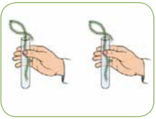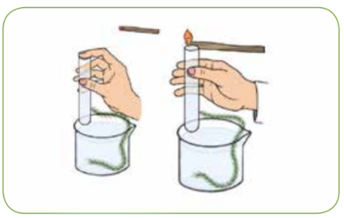 Bước 4: Sau 6 giờ, nhẹ nhàng rút hai cành rong ra và bịt kín ống nghiệm, lấy ra khỏi hai cốc rồi lật ngược lại. Đưa nhanh que đóm còn tàn đỏ vào miệng mỗi ống nghiệm, quan sát hiện tượng xảy ra (Hình 24.3d).