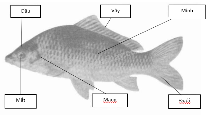 Em quan sát con cá và chỉ ra các bộ phận của nó. Bộ phận nào cá dùng để đớp mồi, bộ phận nào giúp nó bơi.