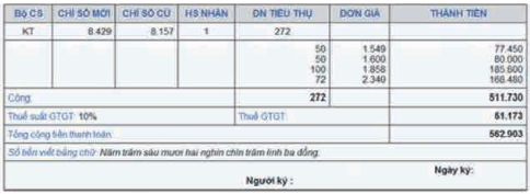 Trong hóa đơn cho biết lượng điện tiêu thụ hết 272 số điện tức là 272 kW, 50 số điện đầu tiên có giá 1549 đồng, 50 số điện tiếp theo có giá 1600 đồng, 100 số điện tiếp theo có giá 1858 đồng, 72 số điện cuối có giá 2340 đồng, tổng cộng tiền điện hết 511730 đồng, thêm 10% thuế nên tổng hóa đơn là 562903 đồng.