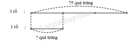 Bác Hoa mang 75 quả trứng gà ra chợ bán. Bác chia đều số trứng gà đó vào 3 rổ. Hỏi mỗi rổ có bao nhiêu quả trứng gà?