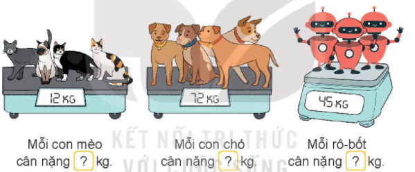 Trong hình dưới đây, các con mèo có cân nặng bằng nhau, các con chó và rô-bốt cũng vậy.