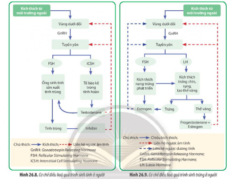 Quan sát Hình 26.8 và 26.9, phân tích quá trình điều hòa sinh tinh và điều hòa sinh trứng ở người