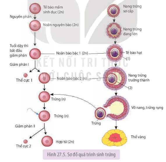– Quá trình sinh trứng: tế bào mầm sinh dục nguyên phân tạo ra noãn nguyên bào, đến tuổi dậy thì, noãn bào bậc 1 giảm phân tạo thành 1 noãn bào bậc 2 và 1 thể cực. Sau đó chúng tiếp tục quá trình giảm phân 2, 1 thể cực giảm phân thành 2 thể cực, noãn bào bậc 2 giảm phân thành 1 thể cực và 1 trứng.