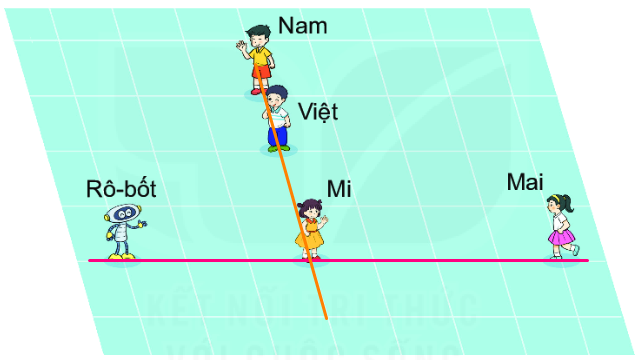 Quan sát hình vẽ ta thấy ba bạn Rô-bốt, Mi, Mai và ba bạn Nam, Việt, Mi đứng trên cùng đường kẻ trên sân: