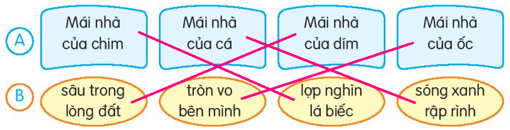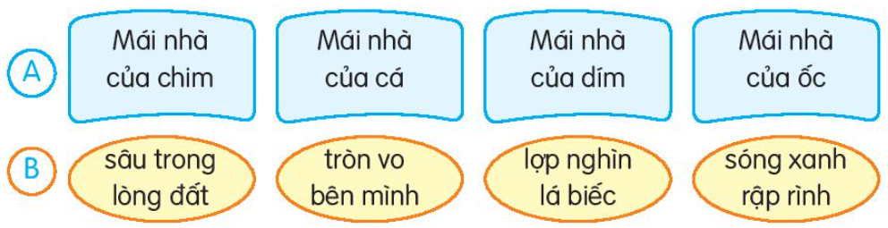 Ghép từ ngữ ở A với từ ngữ ở B để nói đúng đặc điểm ngôi nhà của từng con vật.