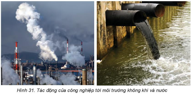 Dựa vào thông tin mục 1 và hình 31, hãy phân tích các tác động của công nghiệp đến môi trường.