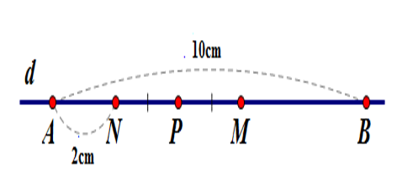 Trên đường thẳng $d$ vẽ đoạn thẳng $AB = 10cm.$ Lấy điểm $N$ nằm giữa hai điểm $A,{\rm{ }}B$ và $AN = 2cm.$ Gọi $M$ là trung điểm của đoạn thẳng $BN,$ gọi $P$ là trung điểm của đoạn thẳng $MN.$ So sánh \(MP\) và \(AN.\)