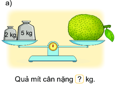 a) Quan sát cân, đọc số đo ki-lô-gam mỗi quả cân ở trên cân đĩa, sau đó để tính cân nặng của quả mít ta tính tổng cân nặng của 2 quả cân trên đĩa cân.