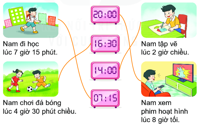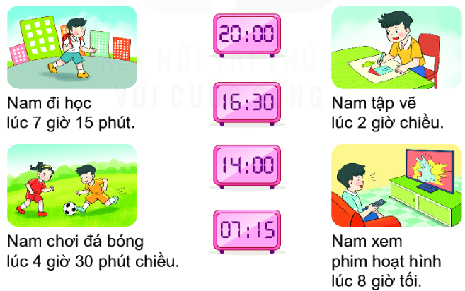 Tìm đồng hồ chỉ thời gian thích hợp với mỗi bức tranh.