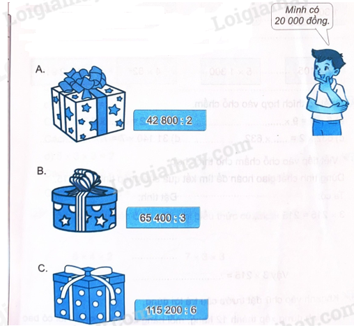 Thực hiện tính phép tính ở mỗi hộp quà rồi so sánh với so tiền mà Nam có.