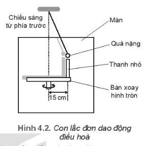 Hình 4.2 là sơ đồ của một bàn xoay hình tròn, có gắn một thành nhỏ cách tâm bàn 15 cm. Bàn xoay được chiếu sáng bằng nguồn sáng rộng, song song, hướng chiếu sáng từ phía trước màn để bóng đổ lên màn hình. Một con lắc đơn dao động điều hoà phía sau bàn xoay với biên độ bằng khoảng cách từ thanh nhỏ đến tâm bàn xoay. Tốc độ quay của bàn quay được điều chỉnh là 2π rad/s. Bóng của thanh nhỏ và quả nặng của con lắc luôn trùng nhau.