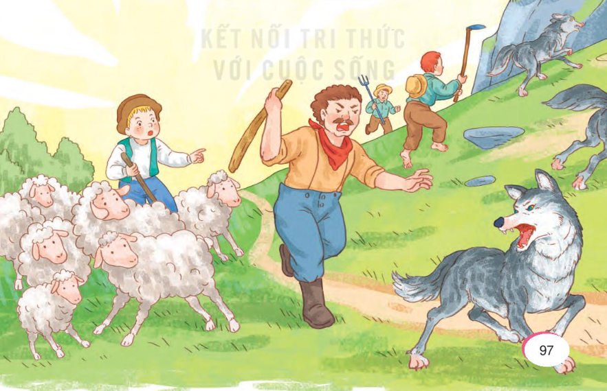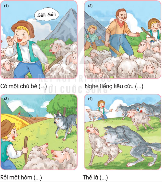 – Tranh 1: Có một chú bé chăn cừu thường thả cừu gần chân núi. Một hôm thấy buồn quá, chú nghĩ ra một trò đùa cho vui. Chú giả vờ kêu toáng lên: “Sói! Sói! Cứu tôi với!”.