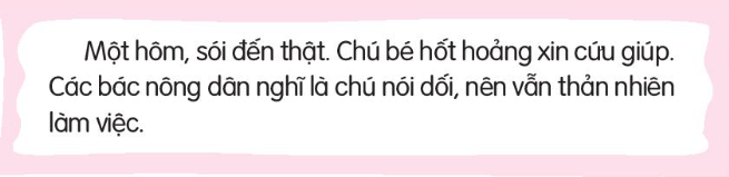 Nghe tiếng kêu cứu, mấy bác nông dân đang làm việc gần đấy tức tốc chạy tới. Nhưng họ không thấy sói đâu. Thấy vậy, chú khoái chí lắm.