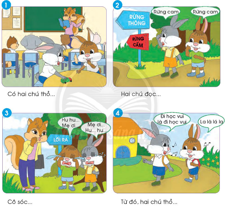 Tranh 1: Có hai chú thỏ chơi trò chơi trong lớp, không chịu nghe cô giáo giảng bài.
