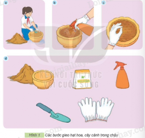 – Các vật liệu, vật dụng, dụng cụ cần thiết để gieo hạt, cây cảnh trong chậu là: chậu cây, đất, hạt mầm, bình tưới nước, xẻng, găng tay làm vườn.