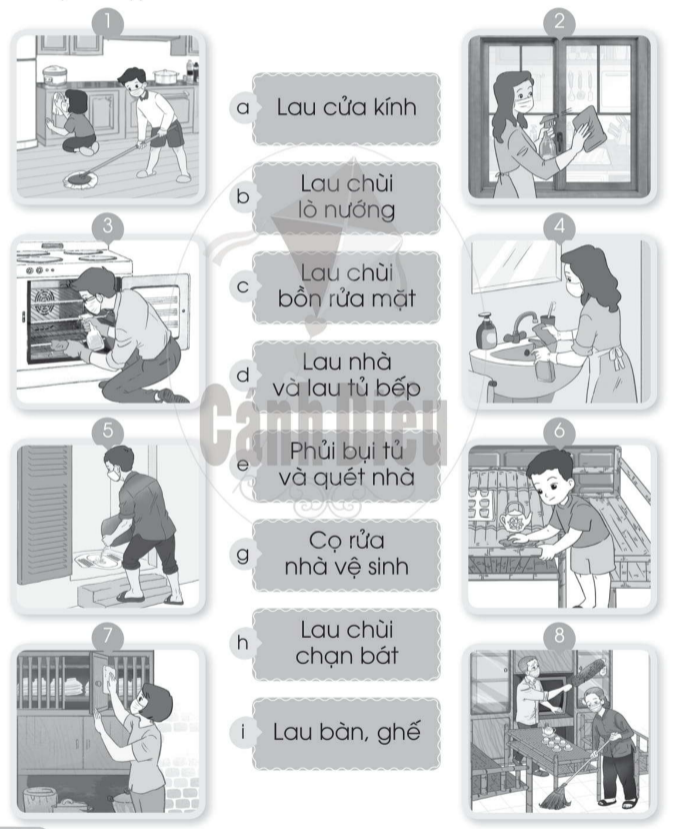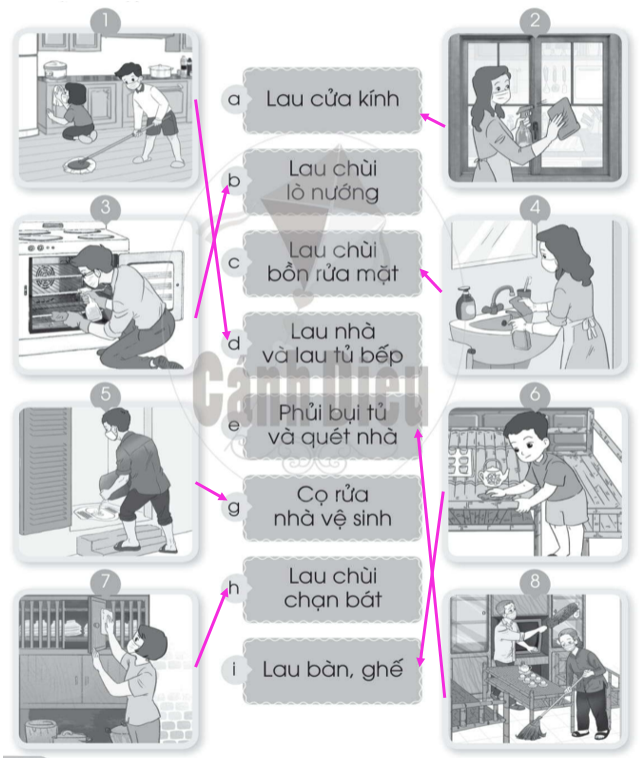 Nối hình với ô chữ về việc làm để giữ sạch nhà ở cho phù hợp.