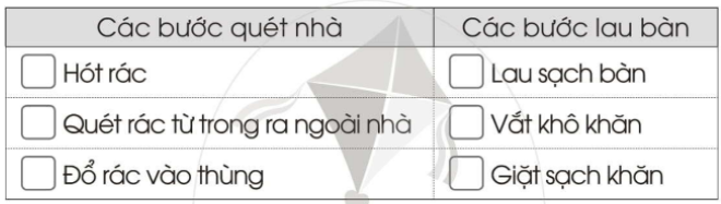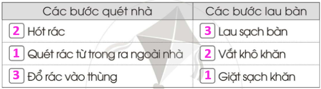 Viết số 1, 2, 3 vào ô □ theo thứ tự các bước quét nhà và lau bàn.